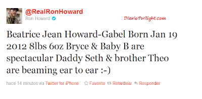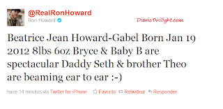 "Jean-Howard Gabel Beatrice nasceu em 19 de janeiro de 2012 pesando 8Kg, Bryce e e o bebê estão espetaculares, papai Seth e seu irmão Theo, sorrindo de orelha a orelha :-)"